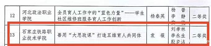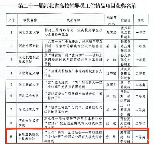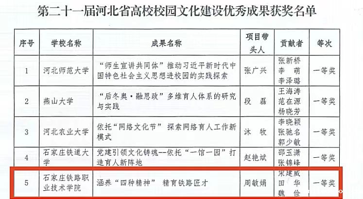 近日,河北省教育厅公布了第二十一届河北省高校思想政治工作成果评选结果。我院申报的《涵养“四种精神”精育铁路匠才》获河北省高校校园文化建设优秀成果一等奖;《善用“大思政课”打造五维育人共同体》获河北省高校思想政治创新案例二等奖;《“五心”共育 互动融合——高职院校“情-知-行”浸润式心理育人模式探索与实践》获河北省高校辅导员工作精品项目二等奖。