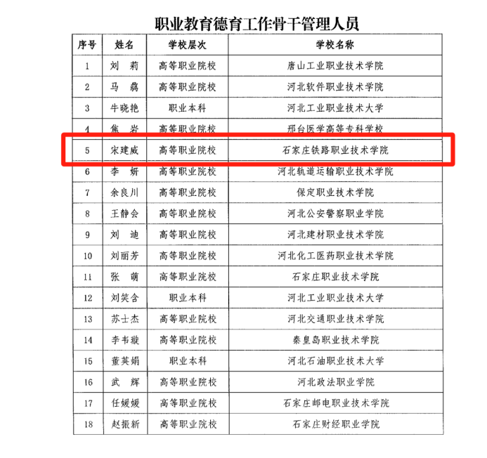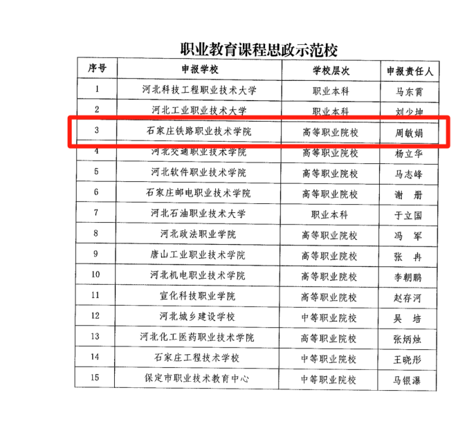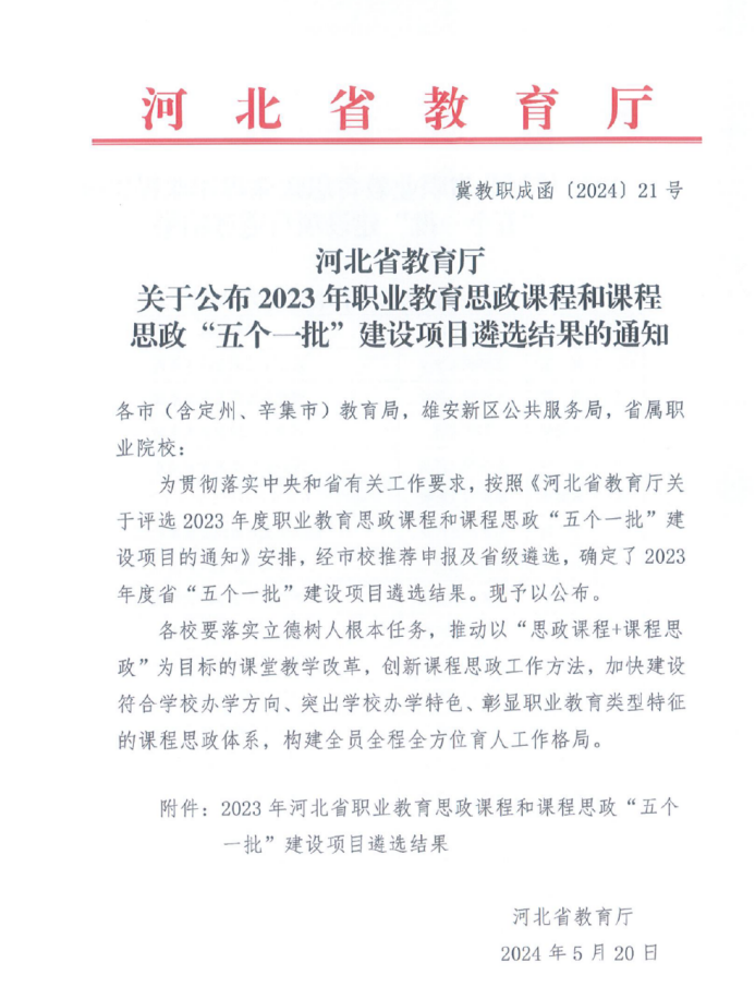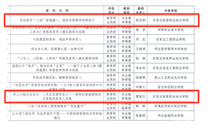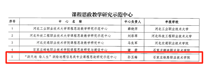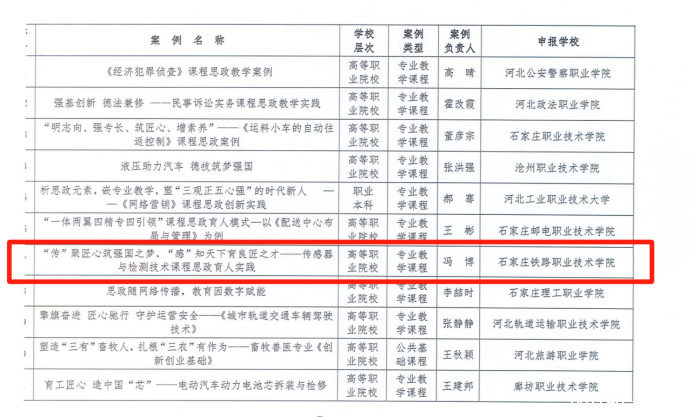 近日,河北省教育厅印发了《河北省教育厅关于公布2023年职业教育思政课程和课程思政“五个一批”建设项目遴选结果的通知》(冀教职成函〔2024〕21号)。米兰体育中心成功入选河北省职业教育课程思政示范校;“测天地 绘人生”测绘地理信息类专业课程思政研究示范中心入选课程思政教学研究示范中心;《“传”聚匠心筑强国之梦,“感”知天下育良匠之才—传感器与检测技术课程思政育人实践》《思政教育“三魂”智能融入,德技并修精育铁路匠才》《穿山打隧志在四方 八双互促精育匠才-盾构机智能控制技术课程思政育人实践》3个项目入选职业教育课程思政优秀教学案例;宋建威、赵辉2人被评为职业教育德育工作骨干管理人员。米兰体育中心共7项成果入选河北省2023年职业教育思政课程和课程思政“五个一批”建设项目,获评数量在我省高等职业院校中位列第一。