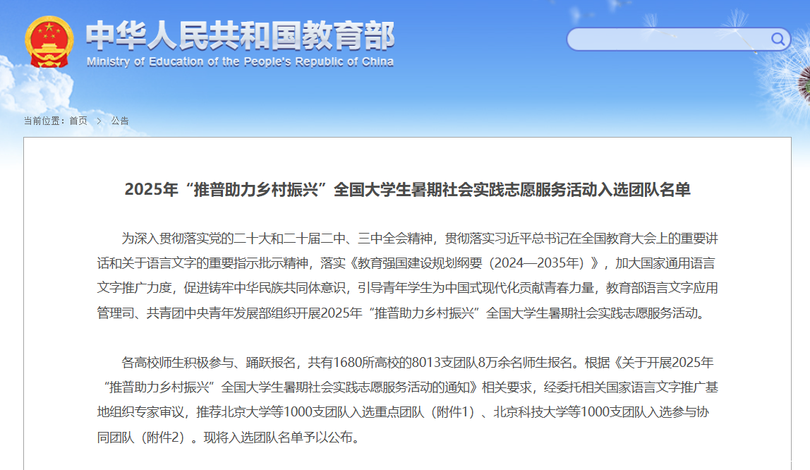 7月3日,教育部公布2025年“推普助力乡村振兴”全国大学生暑期社会实践志愿服务活动入选团队名单,米兰体育中心“铁韵新声”大学生推普志愿服务队成功入选重点团队。
